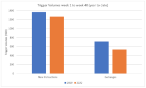 There are two other key triggers that we need to examine prior to ending this client briefing. These are the volume of property coming to the market for sale (New Instructions) and Exchanges. The comparison from weeks 1 to 40 (year to date) between 2020 and 2019 is shown in the following chart for both metrics.